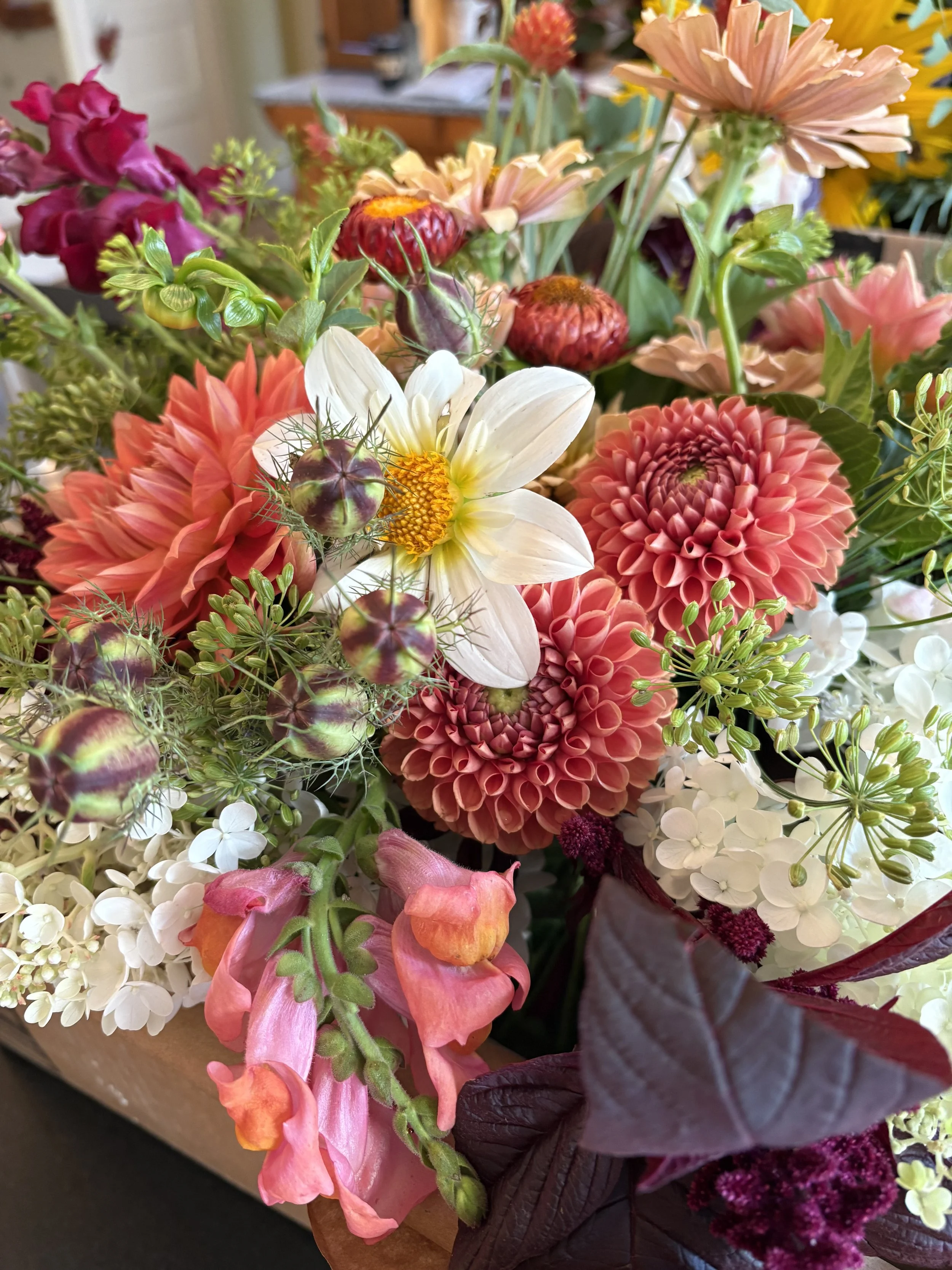 Photo: Dahlias, white hydrangeas, amaranths, dill and zinnias from our garden, blended with snapdragon and strawflowers from Codman Farm.